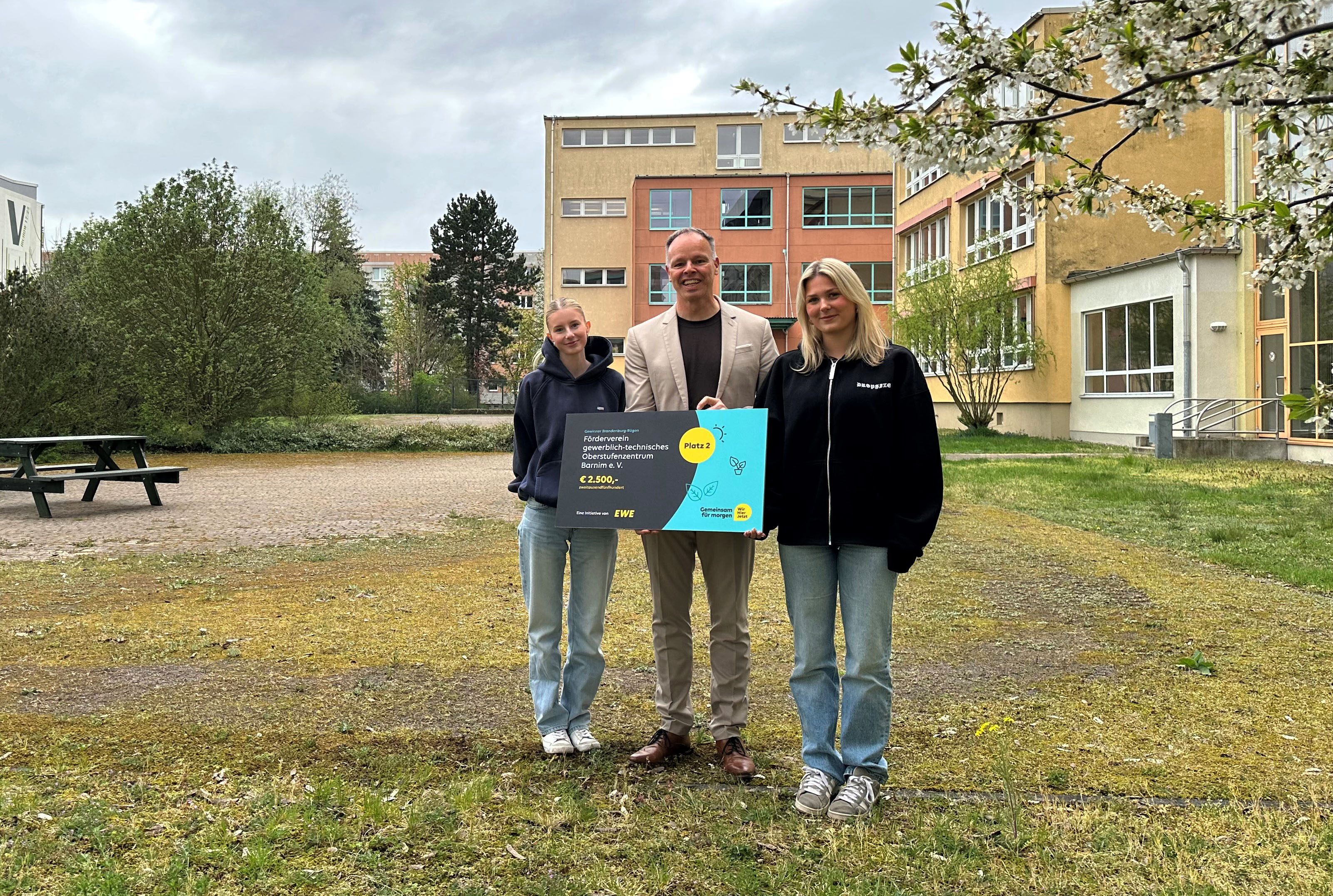 Das Projekt wurde im Rahmen des EWE-Klimawettbewerbs „Wir. Hier. Jetzt. Gemeinsam für morgen.“ mit dem zweiten Platz in der Region Brandenburg-Rügen ausgezeichnet. Zuvor hatte eine Jury aus zahlreichen Bewerbungen eine Vorauswahl getroffen. Anschließend konnten Besucherinnen und Besucher der Wettbewerbsplattform wir-hier-jetzt.com über die besten Projekte abstimmen. Auch das Vorhaben des OSZ II Barnim überzeugte und erhielt genügend Stimmen, um sich einen der beiden geförderten Plätze in der Region zu sichern. Mit dem Preisgeld für den zweiten Platz in Höhe von 2.500 Euro soll die schrittweise Umgestaltung des Schulgeländes weiter vorangetrieben werden. Am Montagnachmittag hat EWE-Pressesprecherin Nadine Auras den symbolischen Scheck an Schulleiter André Haase überreicht. Der Wettbewerb fand bereits zum fünften Mal statt und wurde erstmals in die Regionen Weser-Ems, Weser-Elbe und Brandenburg-Rügen gegliedert. In jeder Region wurden jeweils zwei Projekte prämiert.