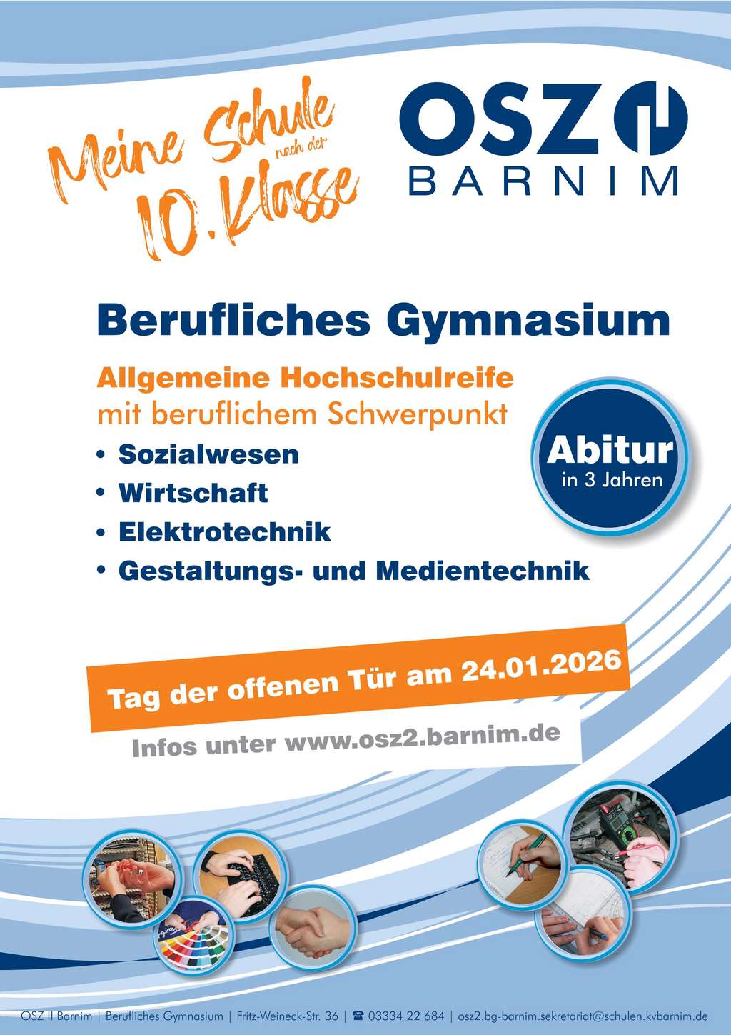 Am 24.01.2026 findet in der Zeit 09:00 - 13:00 Uhr der Tag der offenen Tür statt. Alle Unterrichtsangebote stellen sich vor, ein besondererer Fokus liegt auf den schulspezifischen Besonderheiten wie den berufsorientierten Schwerpunkten, künstlerische Fächern oder Fremdsprachen. Schulleitung, Lehrkräfte und Schüler:innen sind vor Ort und können im persönlichen Gespräch zu allen Herausforderungen der Ausbildung befragt werden.